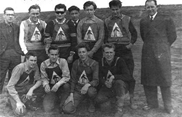Back row left to right. Unknown Supporter, Alf Padgeth, Reg Goode, Brian Anthony, Ted Walker, Johnny Halloran, Alf Padgeth Snr. Manager, front row Left to right Ronnie Gibbons, Colin Booth, Mick de Courcey and Ernie Lamacq Captain.