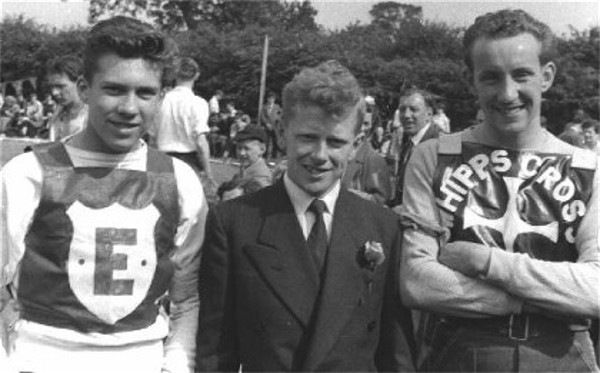 Tottenham Kangaroos Len Adams (left) and John Brown of Whipps X Comets pose with the Late, Great Peter Craven of Belle Vue Aces.