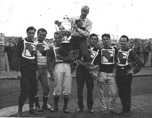 Left to right, Ronnie Gibbons, Terry Greenaway, Malcolm Bell, up aloft holding the Trophy Roy Archie, Sid Tomlyn, Alan Risley, Pete Fraser, not in the picture, Stan Stevens who had to rush off to motor speedway commitment