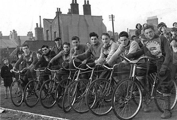 Only 2 riders so far identified, 2nd from the right Alf Still and 4th from the right Reggie Goode