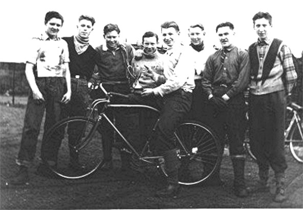 Left to Right Malcolm Brown, Sid Pipe, ???, Mo Taylor, John Woolnough Capt. (on bike), ???, Ken Mills, Sid Sherman.