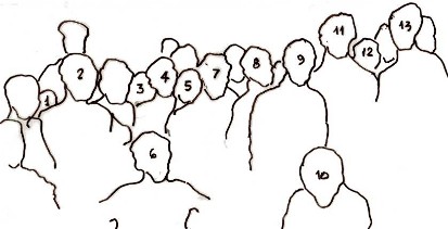 Left to right. 1 Dennis Daniel, 2 Mick Denny, 3 Frankie Morgan, 4 Roy Austin, 5 Alan Kiln, 6 Ronnie Jarrett, 7 Harry Ball, 8 George Strudwick, 9 Henry Brand, 10 Harry Moore, 11 Tommy Jarrett,12 Gussie Greenwood, 13 Ray Braddon.